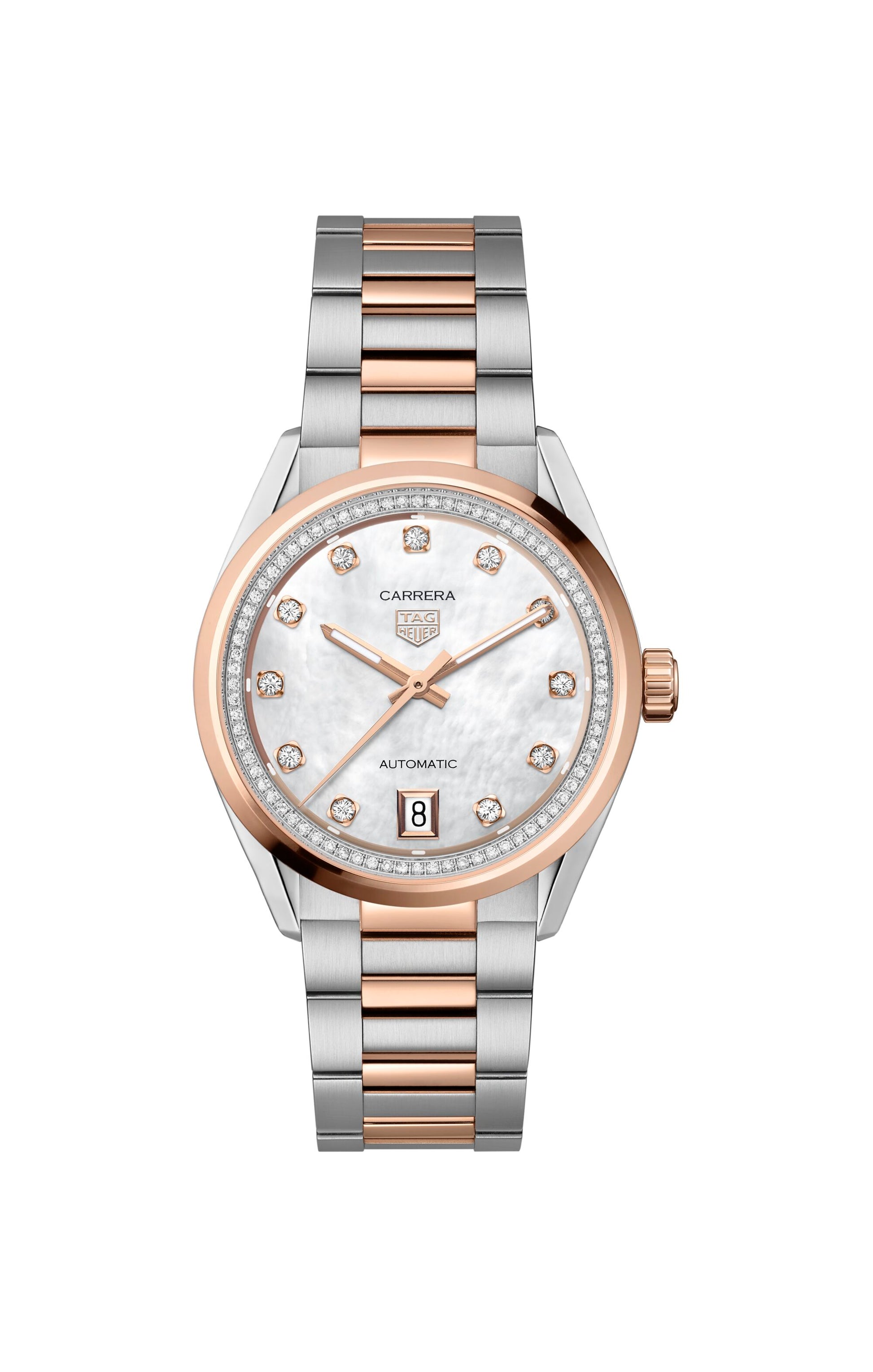 Delve into refined elegance with this 36mm TAG Heuer Carrera Date, where the iridescence of mother-of-pearl echoes the timeless luxury of 18K 5N solid rose gold - a tribute to the original Carrera's legacy, reimagined with classic sophistication.